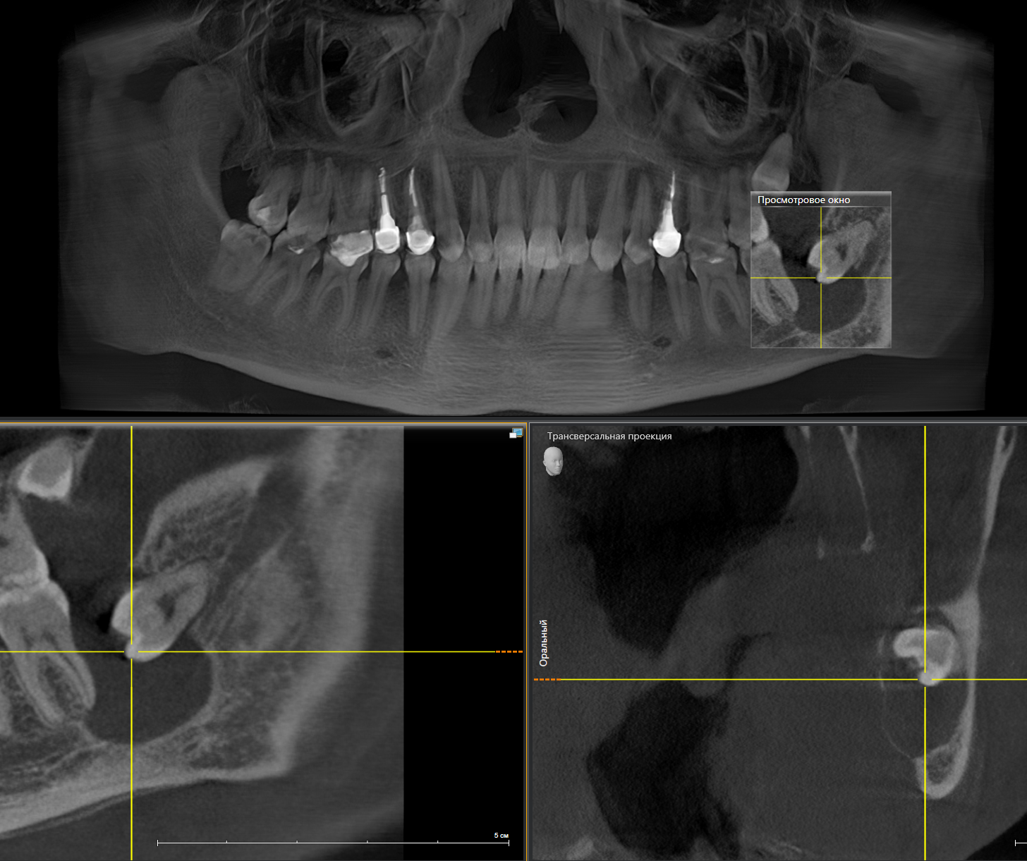 На прием пришла девушка с пожеланием восстановить удаленный ранее в другой клинике зуб на верхней челюсти справа. Ну что ж, без проблем. Направляю пациентку на компьютерную томографию для оценки ситуации. И вдруг я вижу «её» – притаившуюся в пазухе омерзительную восьмерку, которая, противно ухмыляясь, смотрит прямо на меня.
