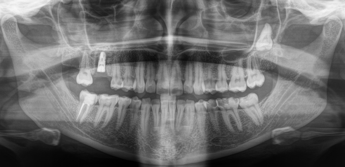 На панорамном снимке, сделанном после имплантации, хорошо видно, насколько высоко и неудачно она располагается: