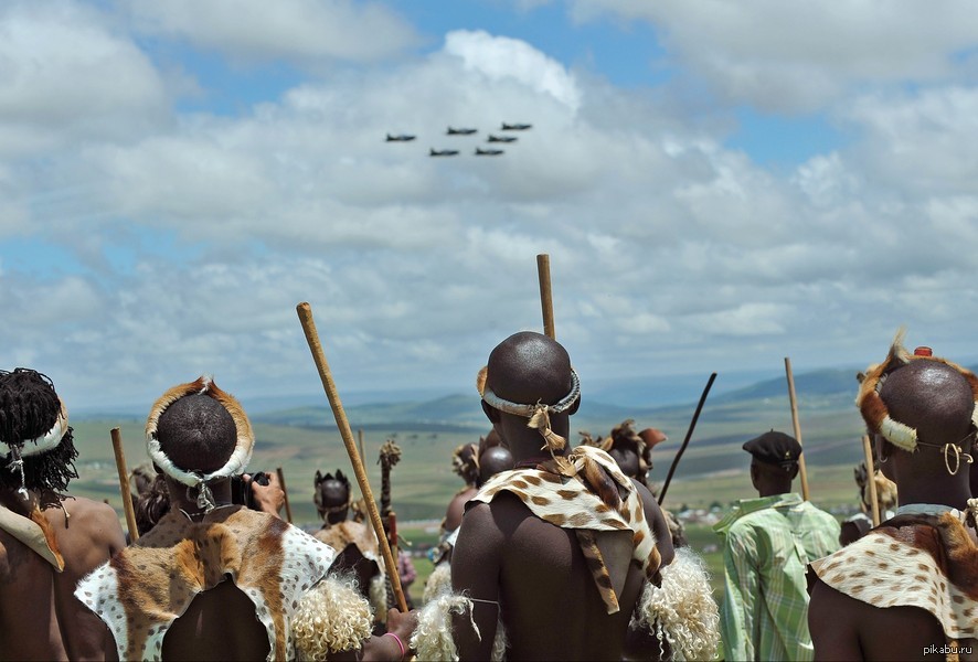 13 Temer 11 лет назад Зулусы, наблюдающие за самолетами ВВС ЮАР во время погребения Нельсона Манделы. Африка ВВС