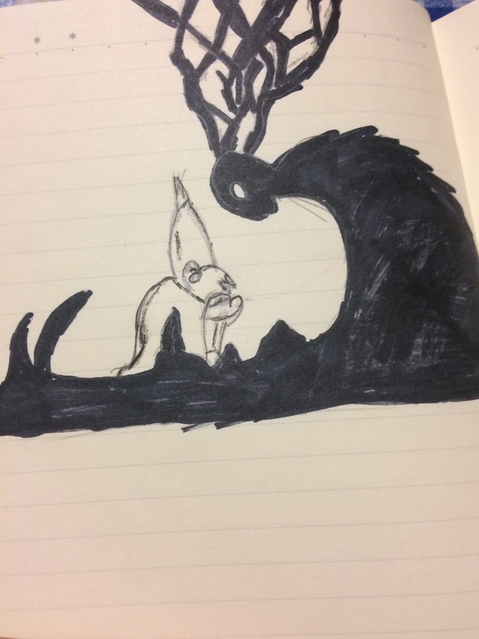 Ему не было и 10ти, когда он впервые увидел его, огромное чёрное существо с оленьими рогами, настолько огромными, что они упирались в потолок, казалось, что существо совсем не отражало света, всё, кроме огромный и жутких белых глаз, словами не передать, на сколько ему было страшно, но когда пришла его мама, она ничего не увидела. Годы шли, но Зверь так и не уходил, он приходил к нему каждую ночь, и просто смотрел на него своими огромными и злыми глазами, иногда оно что-то шептало, но он не мог разобрать что именно. Так продолжалось, пока ему не исполнилось 17, от бессонных ночей, он превратился из пухлого, весёлого, розового мальчика, в бледного, угрюмого,худощавого подростка, когдп ему исполнилось 17, на его глазах умер человек, местный алкаш, Семен Тихий, возвращаясь ночью с очередной пьянки, споткнулся, упал лбом на металлический штырь. Несмотря на то, что это должно было испугать его, именно в эту ночь, он спал как убитый, этобыла первая ночь, ща последние 7 лет, когда Зверь не приходил. Так продолжалось неделю, и он решил что вот оно, наконец-то Зверь ушёл, и можете вообразить его разочарование, когда через неделю он опять увидел его, казалось, что его рога стали больше, а глаза начали блестеть, он опять что-то шептал, но из всего этого он мог разобрать только 2 слова: "голоден" и "покорми". Тогда он понял, что чтобы Зверь ушёл, его надо кормить, так он ступил на скользкую дорожку. Он начал убивать все живое, каждый день он убивал от мышки, до большой собаки, и теперь, когда он стал убивать, зверь перестал приходить, разве что на мгновение сверкали белые глаза или на потолке были видны очертания рогов. И вот, годы шли, и ежедневные убийства вошли в привычку, он не видел Зверя уже года 3, пока однажды, Зверь опять не пришёл, в этот раз он увидел его не в своей комнате, а в подворотне, возле бара, Зверь, казалось, стал ещё больше, рога его стали на столько массивными, что почти достигали крон деревьев, а его тело, казалось, застилало все перед собой, и он опять шептал что-то несвязное. И вот опять начались они, бессонные ночи, одна за другой, сколько бы собак он не убил, сколько бы мышей он не раздавил, он все равно, каждую ночь видео Зверя. Это сводило его с ума, он понимал, что зверь хочет, чтобы он начал убивать людей, но совесть ему не позволяла. Так прошло ещё 2 года, а потом началась война, его призвали как срочника и за все 4 года что он воевал, он не разу не видел Зверя, и даже когда он вернулся домой, он все равно его не видел, ещё 5 лет, за это время он женился и у него родились 2 чудных ребёнка. Он решил, что наконец-то, его жизнь наладилась, и вот опять пришёл Зверь, теперь он казался ещё больше, на столько, что его рога были по всему потолку, а сам Зверь, согнулся, чтобы смотреть на него. Тут он понял, что ему надо сделать, он не может не убивать, ибо Зверь сведёт его с ума, но и с семьей он остаться не мог, боялся что однажды убьёт их. Поэтому он накинул на себя плащ, и ушёл. Годы шли, но никто не мог его найти, так что его семья объявила его пропавши с безвести. Лишь через 7 лет, полиция, отслеживая пропажу 20 человек нашла его в давно брошенном доме, со всех стен свисали цепи, дом был уставлен ваннами с частями человеческих тел, по всему дому пахло саженой плотью, его нашли на чердаке, он был одет в тот же плащ, только на этот раз плащ был весь рваный, вид его был безумный и болезненный, он с