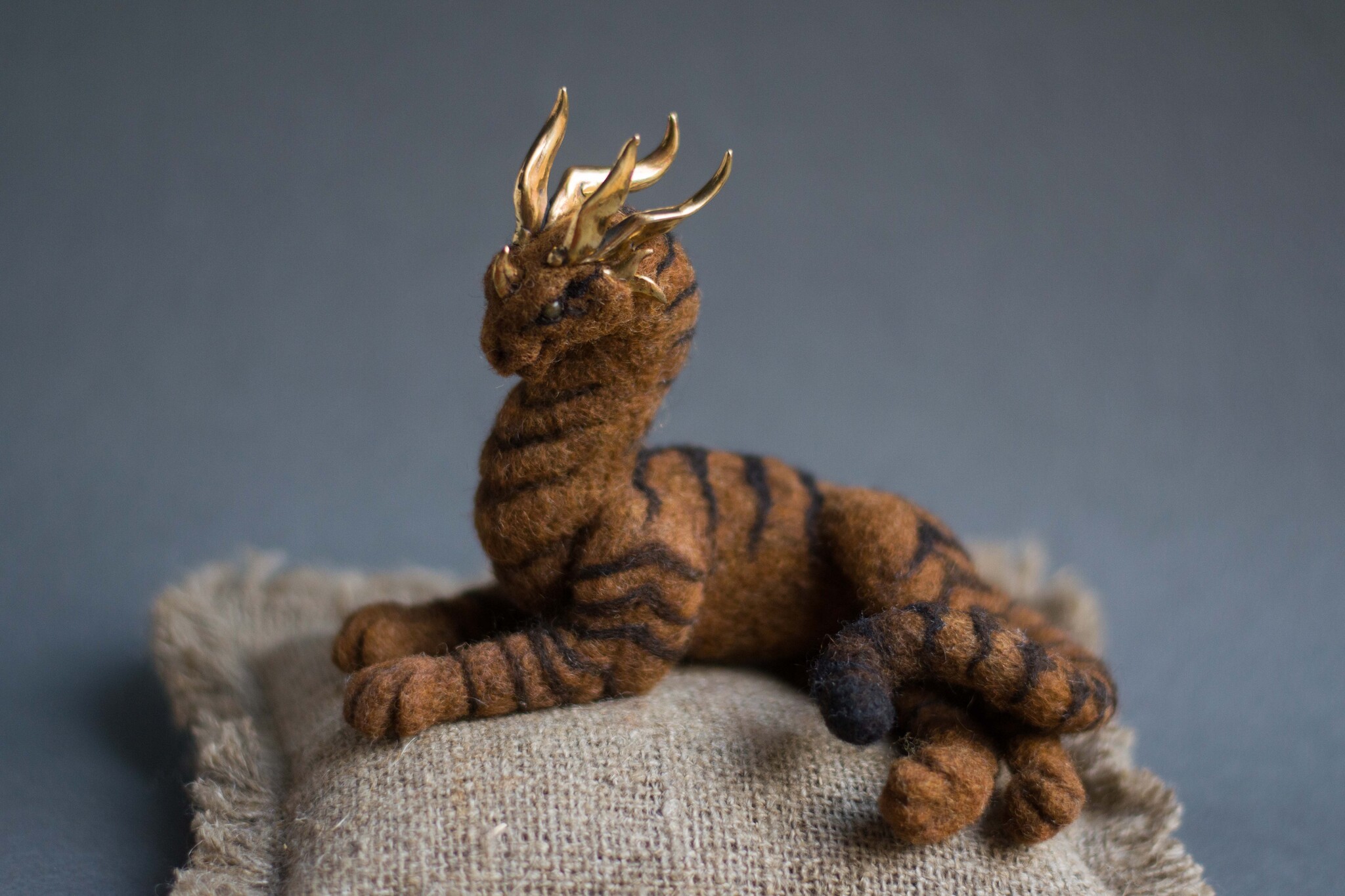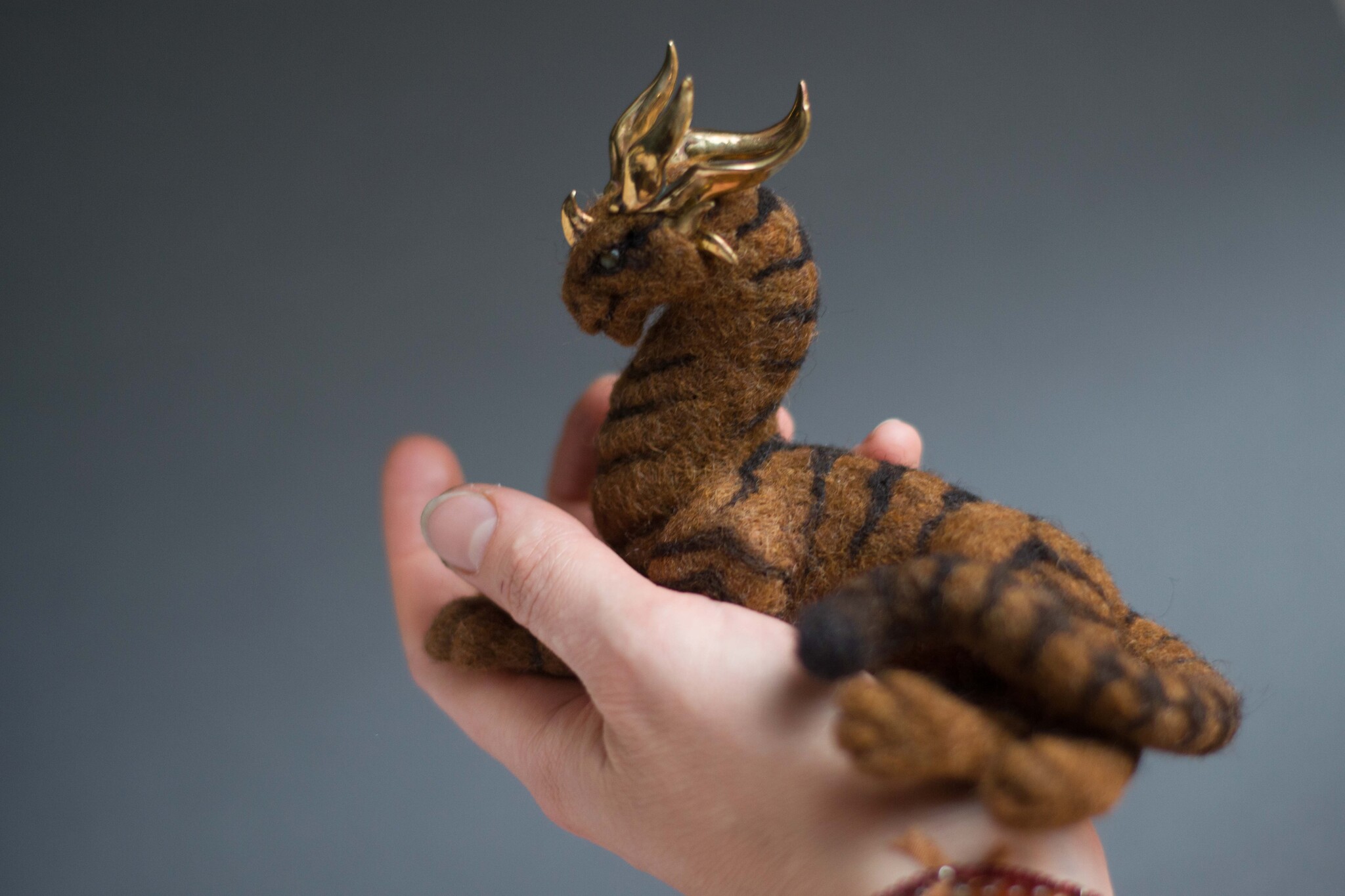 Вот такой тигродракон получился. Рога и шипы из ювелирной латуни, глаза - натуральный камень соколиный глаз. Каркас только в шее и в хвосте, остальное - овечья шерсть.