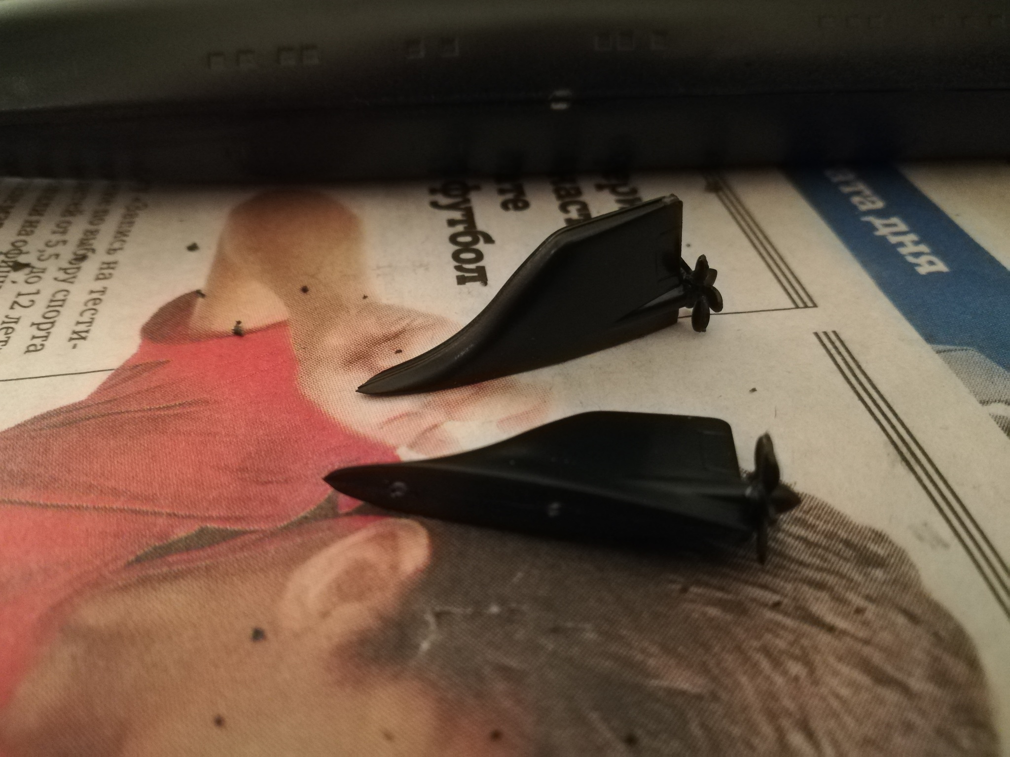 С плавниками тоже не очень геморно. 2 половинки и винт. Удостоверившись, что всё склеено относительно ровно, приклеиваем плавники к задней половине корпуса. Теперь можно перейти к подставке.