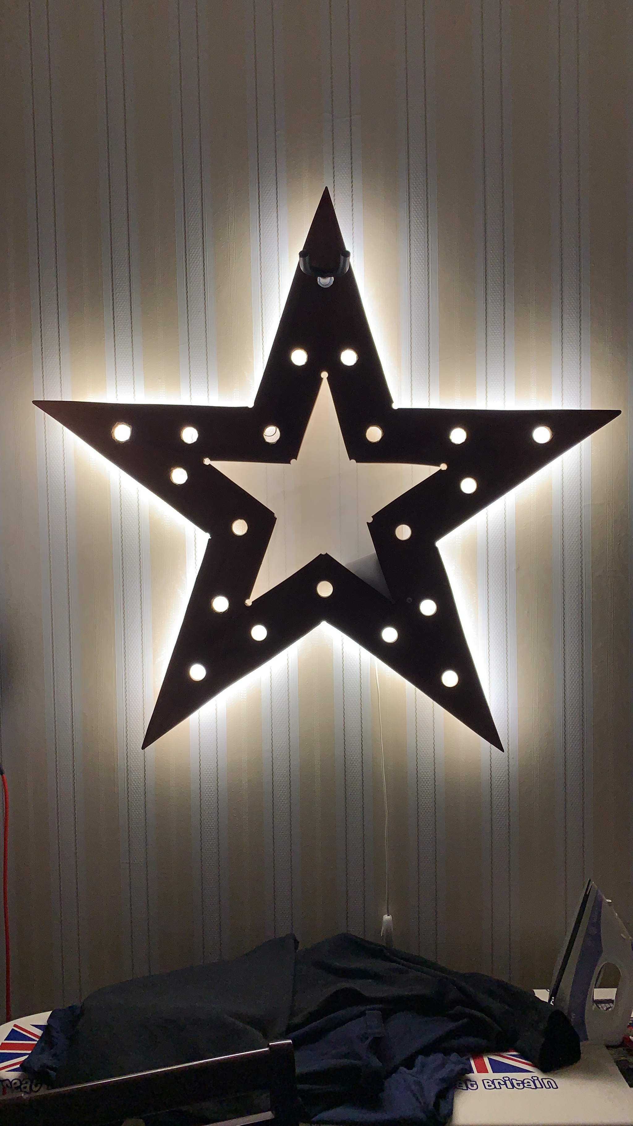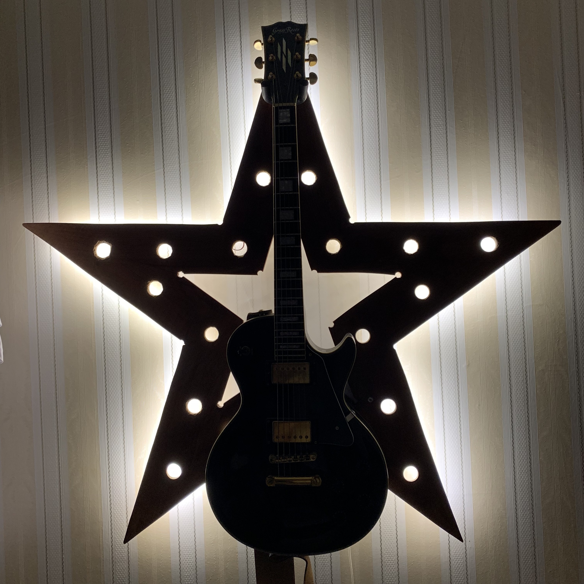 На втором фото - сверху висит мой гибсон, т.к. звезду повесил за одно из отверстий, оставшихся после лампочек.