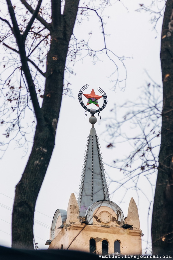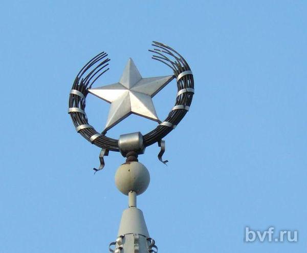 Сталинские высотки со звёздами на шпилях были построены как символы победы над Германией. Наш Воронеж не догонишь тоже решил не отставать от Москвы и у нас тоже есть уменьшенные копии сталинских высоток, напоминая о том, что Воронеж всё-таки меньше Москвы, но всё же достоин носить эти символы. Это высотка в ЮВЖД, девичинская высотка, звезда у Политеха, ну и звезда на 25-летия Октября 48. Хотели ещё построить ВГУ, как уменьшенный МГУ, но Хрущёв раввин, сделал проекту обрезание.