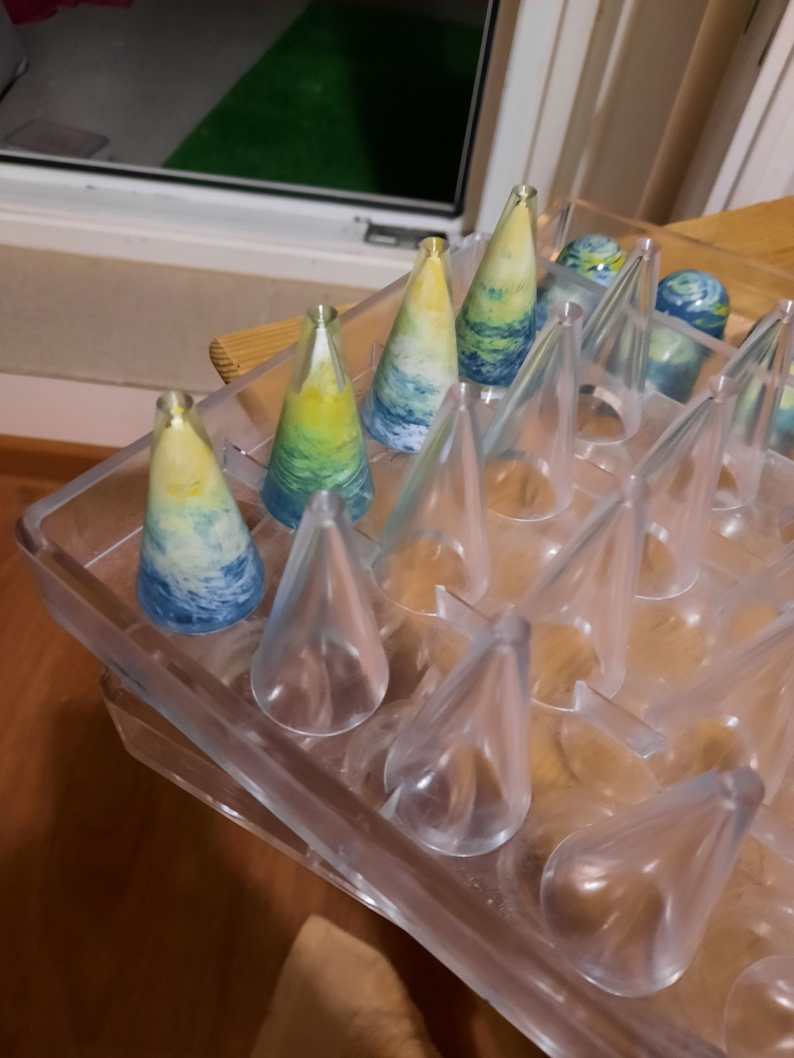 Мне всегда нравилась яркая эмоциональная манера живописи Ван Гога, как и импрессионизм в целом - мне это близко))) а поскольку сейчас я развлекаюсь конфетками - решила, что сделать наборчик с отсылкой к искусству - отличная идея))) кругленькие с начинкой лайм, конусы - горький шоколад+апельсин, корпусы из горького шоколада с низким содержанием сахара