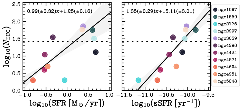 Количество обнаруженных кандидатов в скопления, формирующиеся в галактиках, положительно коррелирует с интенсивностью звездообразования (SFR) и удельной скоростью звездообразования (sSFR), что подтверждается линейной зависимостью, представленной на графиках (±1σ).
