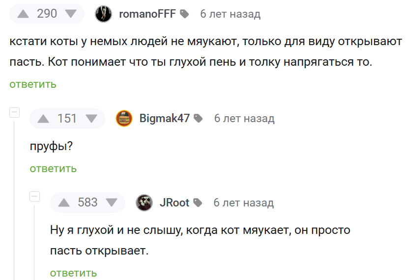 7775 MirVcegda23 Кот Звучит логично1 6 месяцев назад #comment_134150474 Комментарии на Пикабу Глухота Мяуканье Юмор Скриншот Кот 285 19 5 3 3 Ещё 0
