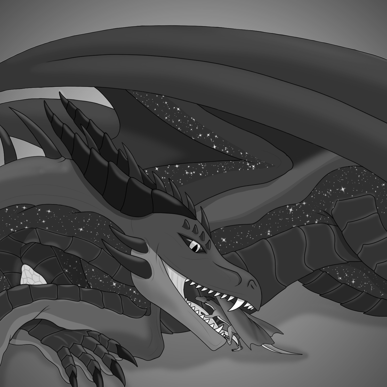 Увы, моё сияние... столь естественное и неотъемлемое - создаёт мне некоторые затруднения. Скрыться в объятиях тьмы мне едва ли под силу... звёзды, что мерцают на моей чешуе, и фиолетовое свечение, струящееся вдоль моего тела, выдают меня с изысканной неизбежностью.