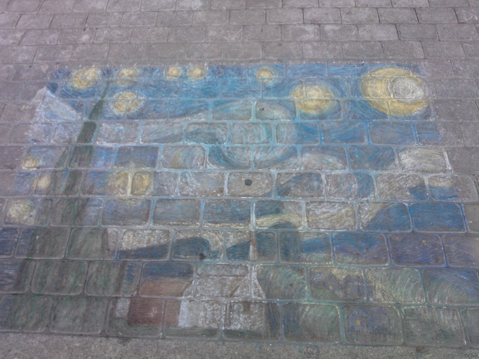 6 kloyn2303 "Звёздная ночь" Винсента ван Гога мелом на тротуаре (Рига). 11 лет назад Рисовали две очень милые девочки лет 13-15) [моё] Рига Ван Гог Звездная ночь Ван Гога Рисунок мелом