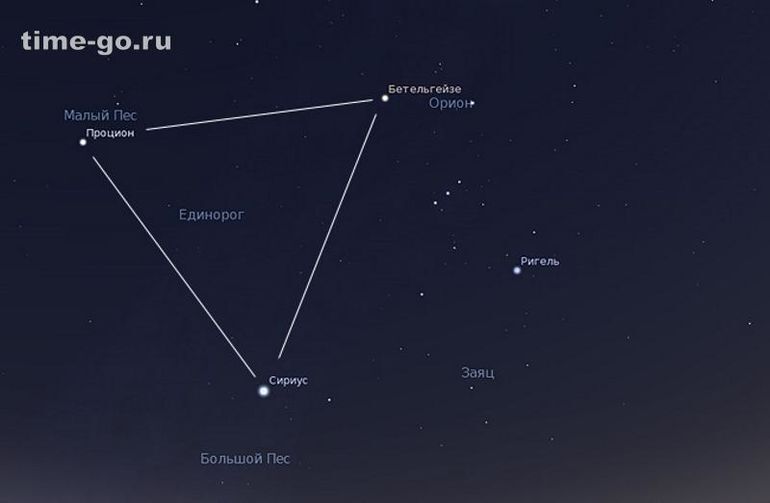 Сириус - самая яркая звезда не только в зимнем звездном треугольнике, но и вообще на земном небе (минус 1,6 звездной величины). Египтяне Сириус называли и Лучезарной Звездой Нила, и Сотис (древнеегипетское олицетворение Сириуса в виде египетской богини, известной древним египтянам как Сопдет), и Слезой Исиды, и Царём Солнца, и Пёсьей звездой.