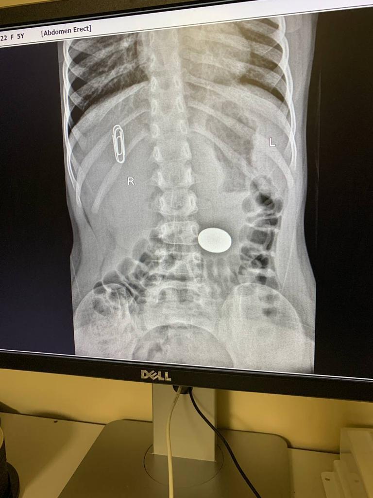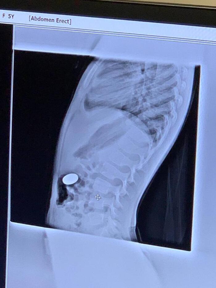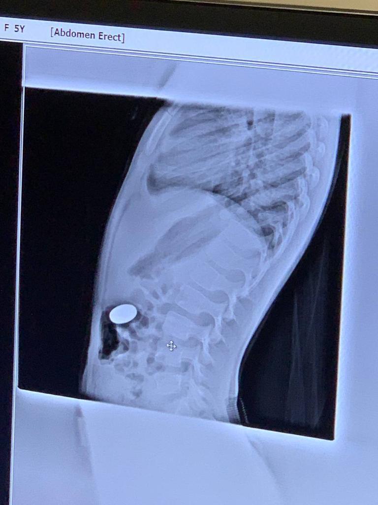 Посмотрели. 5ти Рублевая монета в желудке. Достали без происшествий. Отпустили с богом.