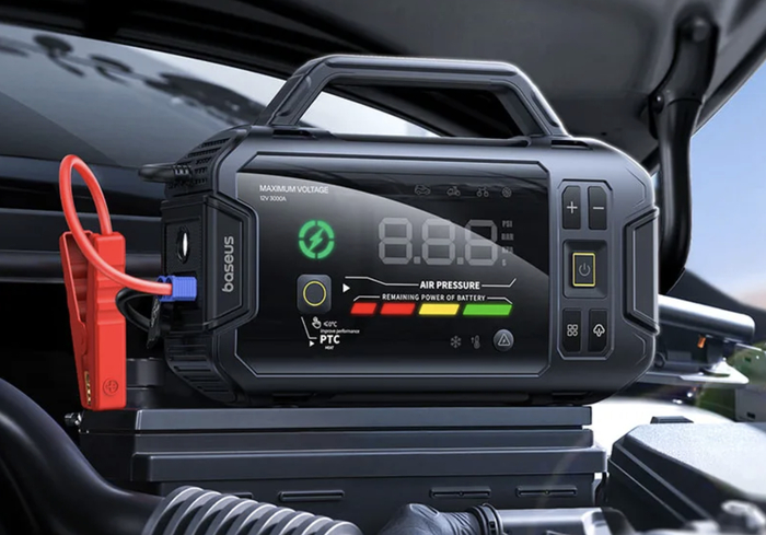 Многофункциональное устройство совмещает мощный пусковой ток, воздушный компрессор, портативную батарею и фонарь.