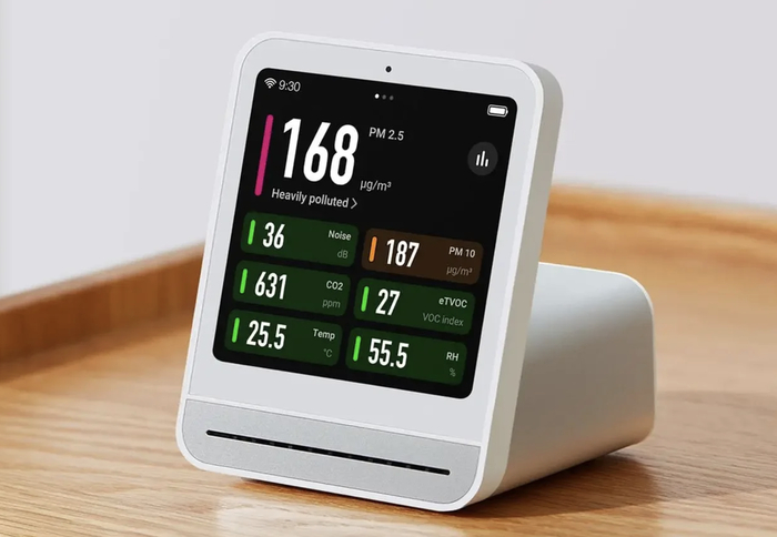 Прибор анализирует параметры атмосферы в помещении: PM2.5, PM10, CO₂, влажность и температуру.
