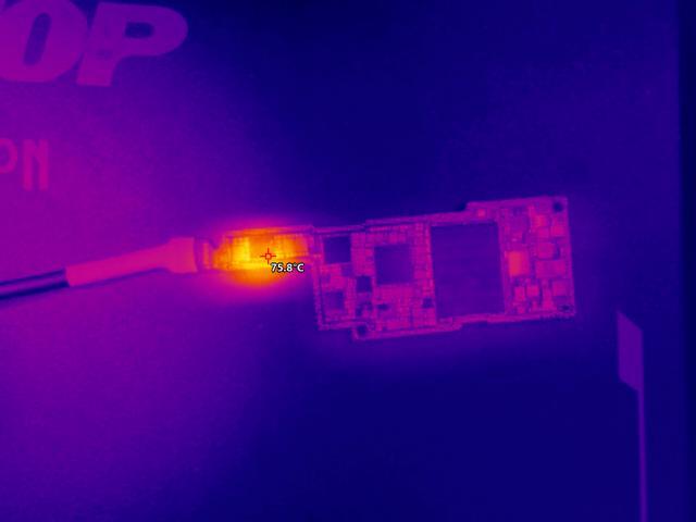 Снимаем дисплей, аккуратно добираемся до платы. Подключаем лабораторный блок питания напрямую к материнской плате и тут 2 Ампера потребления по первичной линии питания. Тепловизор показал, что нужно распаивать плату. После распайки, находим виновника - контроллер питания.