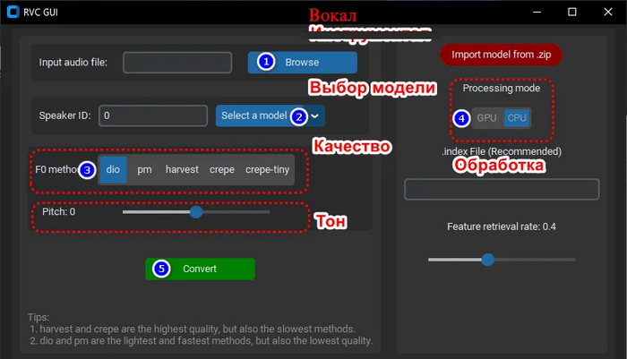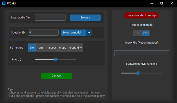 RVC-GUI — это удобная оболочка с открытым исходным кодом созданная для упрощения управления параметрами нейронной сети RVC применяемой для синтеза любого голоса/музыкальной композиции. По сравнению с аналогами, не требует установки и настройки сложных библиотек или использования Linux. Для работы программы достаточно Windows 10/11 и относительно современного ПК.
