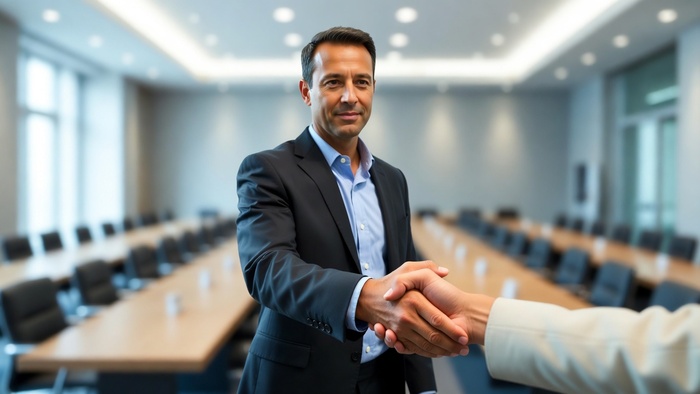 Энергия переговоров. Мужчина запечатлен в момент встречи, жмет руку партнеру, динамичная и открытая поза. Фон — просторный конференц-зал, освещение яркое и равномерное. Объектив 50 мм, эффект присутствия, разрешение 4K, корпоративные синие тона.