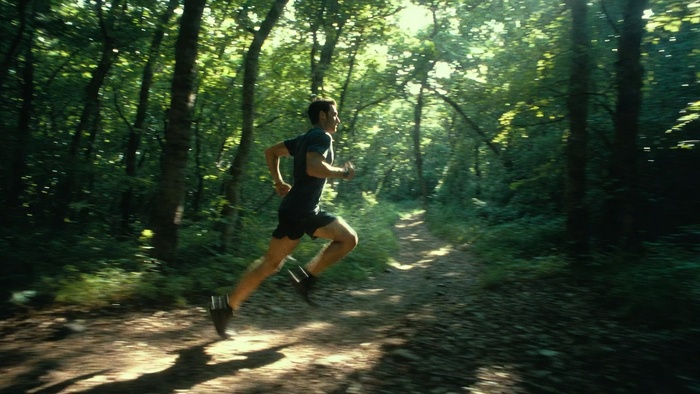Лесной кросс. Мужчина бежит по узкой лесной тропе, капли пота на лице, атлетичное телосложение. Фон — деревья, сквозь которые пробивается утреннее солнце. Объектив 50 мм, эффект движения, разрешение 8K, насыщенные зеленые тона.