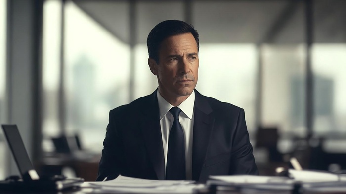 Классика для резюме. Мужчина в дорогом деловом костюме, стоит у стола с документами, серьезный и сосредоточенный взгляд. Фон — современный офис в небоскребе, мягкое офисное освещение. Объектив 85 мм, малая глубина резкости, разрешение 8K, нейтральные цвета.