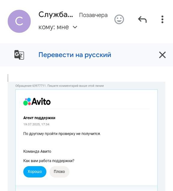 Я также пишу что мы пытались пройти проверку 3 раза, и все три раза аккаунт отлетал в бан, затем также с "танцам и бубном" тех.поддержке удавалось разблокировать акк, но это очень времязатратное занятие. На что авито дает ответ: