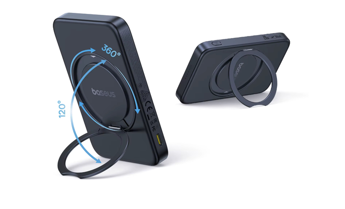 Кольцевой упор на корпусе работает как подставка, позволяя расположить смартфон вертикально или горизонтально. Такой формат удобен для просмотра фильмов, чтения или видеозвонков. Повербанк подходит для поездок, дома, офиса и любых ситуаций, где требуется компактное решение с удобным креплением.
