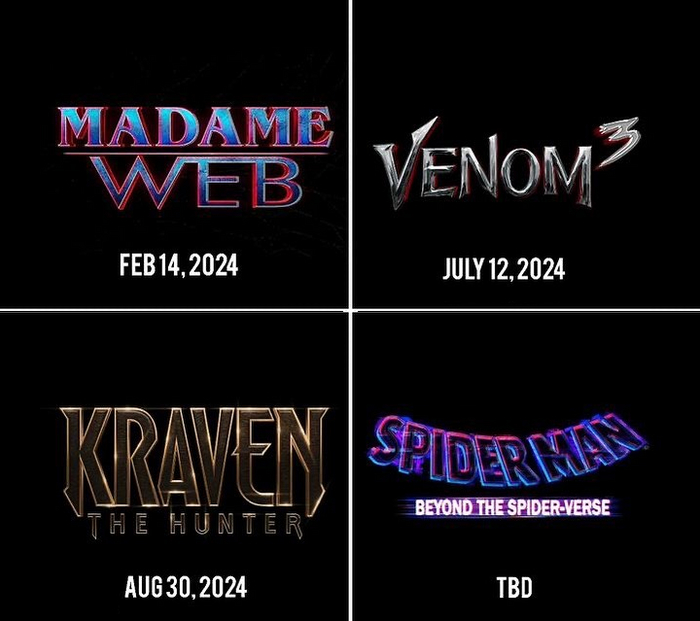 Студия Sony перенесла «Мадам Паутину» на 14 февраля 2024, «Венома 3» на 12 июля 2024, «Крэйвена-Охотника» на 30 августа 2024, а мультфильм «Человек-Паук: За гранью паутины вселенных» потерял дату выхода.