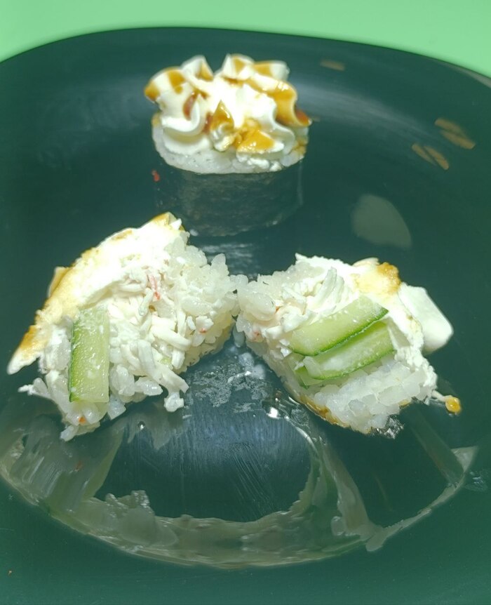 Тэмпура — категория блюд, приготовленных в кляре и обжаренных во фритюре. Сверху мы видим майонезную шапочку, внутри нори, курица и зелёный лук, думаю, что Куни Ли и лук не очень сочетаются) Если не ковыряться, а съесть рол целиком то лук не чувствуется совсем, вкус сладости, я сначала грешила на тэмпуру, но позже поняла что это рис сладкий. То есть они переложили сахара в рис и поэтому все суши казались немного сладковатыми, сам рис очень плотный, туго скручен. Это неплохо, голодному зайдёт за милую душу, и не поймёшь что ты съел))