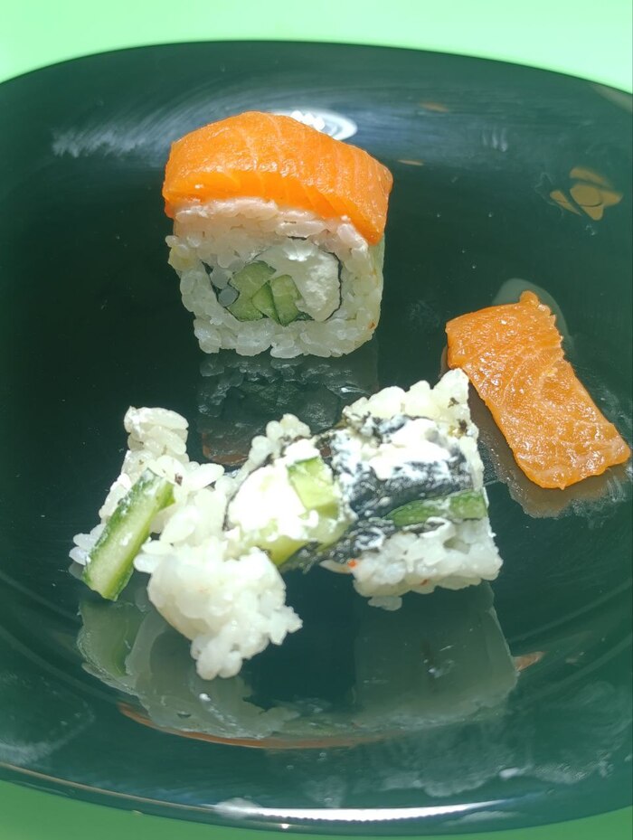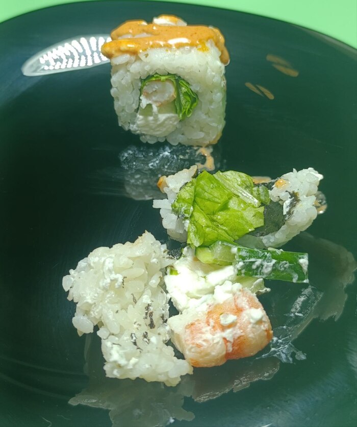 Как же прекрасно есть суши без тэмпуры, но именно здесь я поняла что весь рис сладкий. Внутри огурец, салатный лист, нори, сыр сливочный и настоящая креветка, кстати, неплохая, упругая и мясистая (но на следующий день она уже начнёт сдавать позиции). Соус даёт остринку, зелень свежесть, если бы не сдаковатый рис, вообще бы хорошо было.