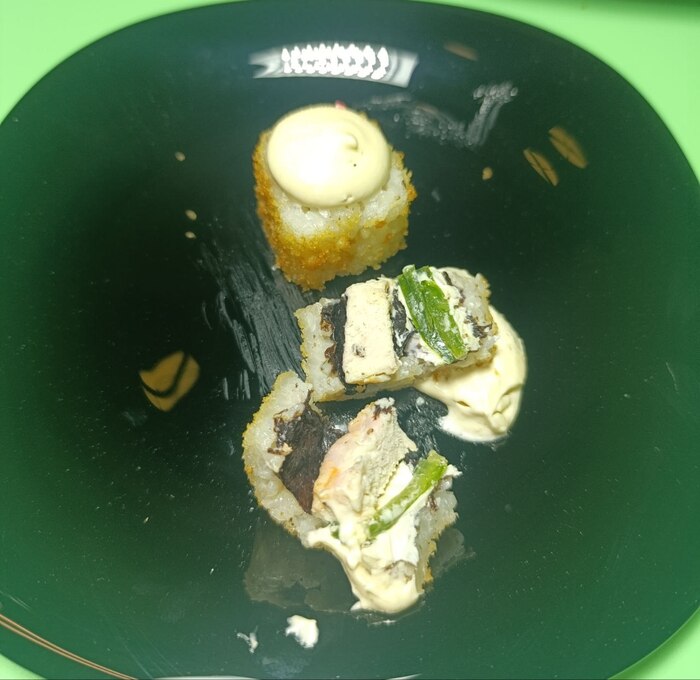 Здесь принцип готовки такой же, только сверху подкрашенный майонез с икрой летучей рыбы, а внутри сливочный сыр, нори и что-то типа сыра тофу. Опять сладость во вкусе, не спасает даже васаби. Сами продукты не плохие, но ты это точно не ассоциируешь с суши, это калорийно, нажористо и сытно.