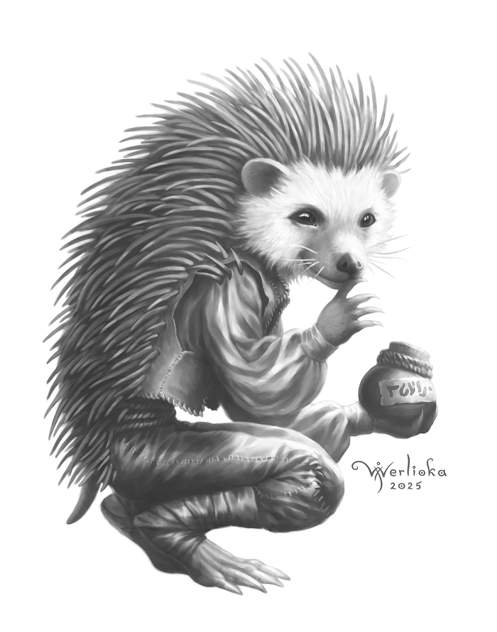 Урхин или Хургин — это диалектное название ежа, а еще так сегодня называют озорных мальчишек. Но раньше этим словом именовали маленьких фейри, умеющих принимать облик ежика. Узнать их можно по более антропоморфным пропорциям и по глазам, которые выдают ум и хитрость. Судя по всему, это не очень опасные, но довольно злокозненные создания. Урхин на моем рисунке задумал какую-то шалость, для которой ему потребовалась баночка с волшебным порошком.