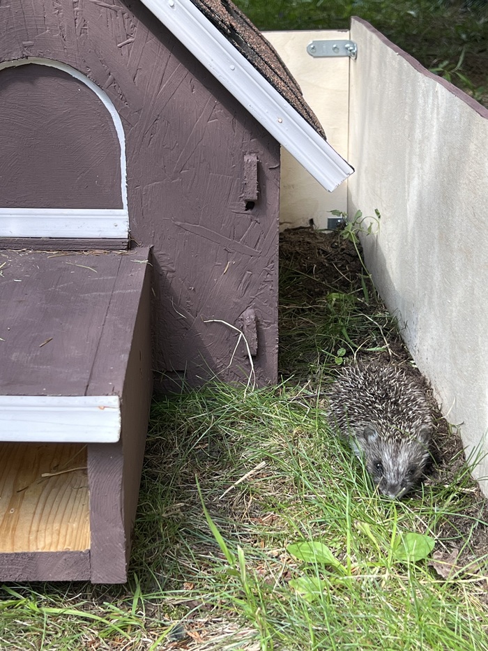 Ежата очень рады, что получили в пользование свой личный участок, часто выходят прогуляться и покушать. Кормим теперь исключительно на улице, в домике оставили только маленькую мисочку с водой, которая пользуется у них большой популярностью.