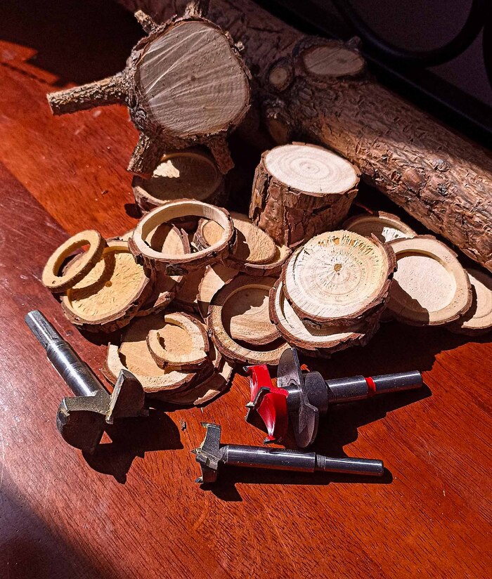 После Нового года я сохранил ствол от сосновой “ёлки”. Просто не хотел выбрасывать. Решил из неё сделать круглую рамку. План был простой: взять сверло Форстнера нужного диаметра, просверлить в стволе углубление, а потом отпилить лишнее с двух сторон — получится цельная рамка с задней стенкой. Толщина всей конструкции должна быть 4 мм.