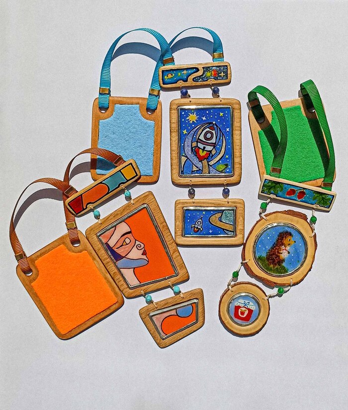 На задней стороне гравером сделал небольшие выемки и приклеил туда маленькие деревянные полоски — это будущие отверстия для ленты. Тоже очень долго думал над формой отверстия, пробовал разные варианты на тестовых подвесах, которые всегда получались неровными. В итоге остановился на скрытом варианте.