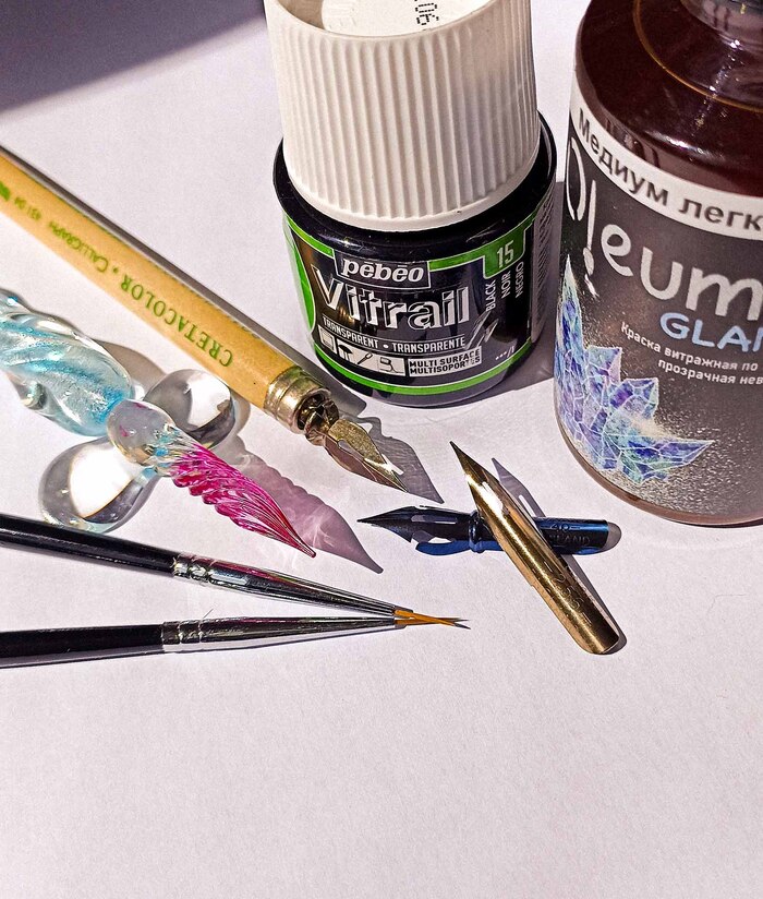Эскизы эскизами, но нужно браться за кисточку. На этом этапе требовалось подготовить рисунок с окончательной формой и цветами. Использовал Pebeo Vitrail — это прозрачные витражные краски. У них важная особенность — итоговый оттенок зависит от цвета стекла.