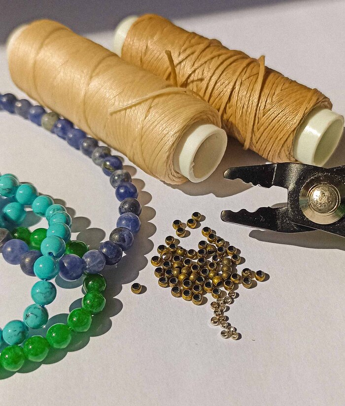 Все детали лицевой части были готовы, осталось скрепить их. Мне конечно опять захотелось немного разнообразить конструкцию. Купил вощеные нитки из полиэстра и бусины из минеральных камней: содалит, бирюза и зелёный кварц диаметром около 4 мм.