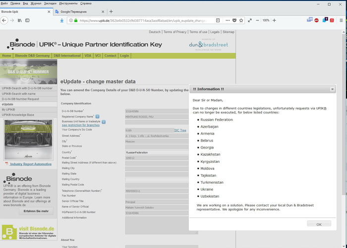 Из-за изменений в законодательстве разных стран, к сожалению, запросы через UPIK® больше не могут выполняться для стран, перечисленных ниже:
