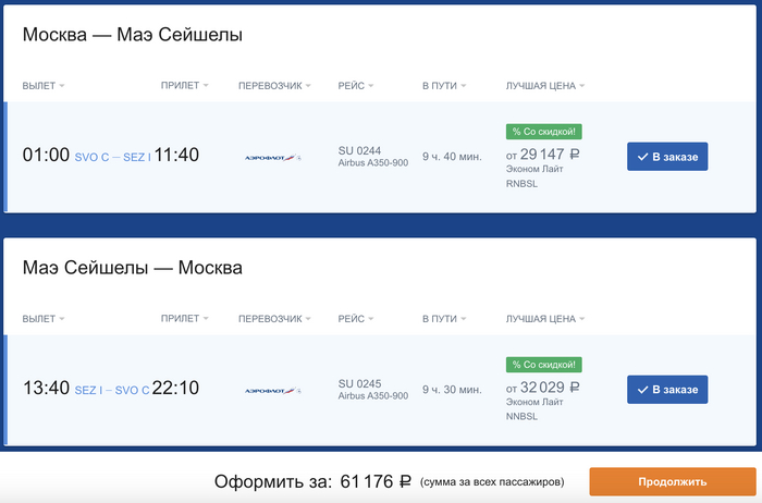 ❗️Экстра: Вообще на Сейшелы сейчас хорошая цена сама по себе, если брать на сайте «Аэрофлота». Продают за 61 тыс. в обе стороны с вылетом в выходные дни.