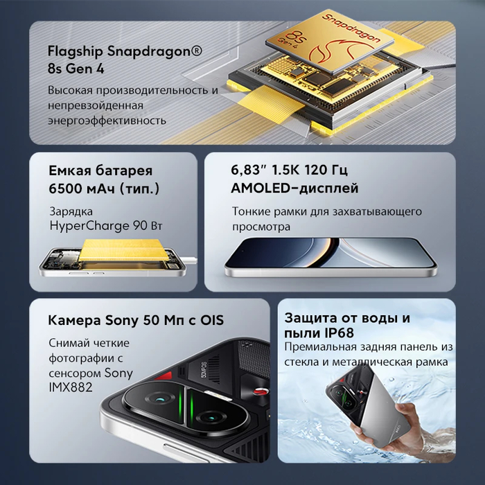 Poco F7: Работает на чипсете Qualcomm Snapdragon 8s Gen 4. Это восьмиядерный процессор, поддерживающий высокую производительность и энергоэффективность. Графический ускоритель последнего поколения гарантирует отличную графику в играх и приложениях.