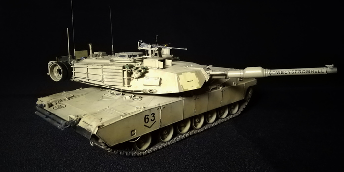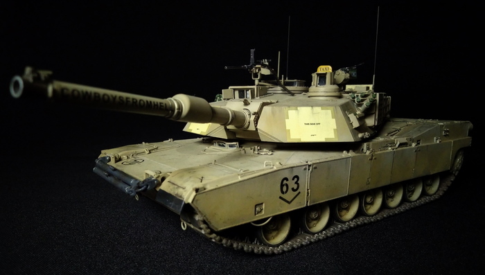 Представлена модель M1A2 SEP Abrams под номером 63 с собственным именем «Cowboys From Hell» из состава 1-го батальона 8-го Кавалерийского полка 2-й бригады «Black Jack» 1-го кавалерийского дивизиона, Ирак, 2004 год. На танке установлен пулемёт .50 калибра на крыше башни, фаркоп на носу корпуса и элементы усиления бронирования. Сложная и качественная модель от китайской фирмы Dragon, масштаб 1/35.