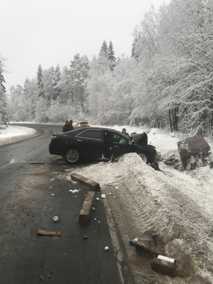 Отдохнув и собрав вещи, 28 декабря мы отправились домой. И отъехав буквально 20 км от Лахденпохья на повороте мне навстречу едет грузовик с открытым прицепом, в котором были большие гранитный блоки. И тут на этом повороте я как в замедленном видео вижу, как блок начинает скользить, створка кузова отламывается и блок падает прямо передо мной.