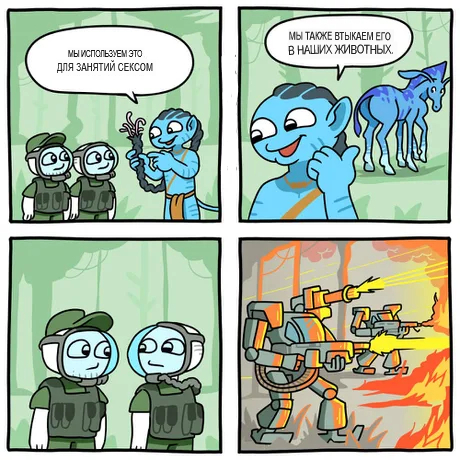 Мне жмет мое советское образование, дети. Логика, там психология, философия и прочее д... мо. Джейк Саливан, он же Женя Саливанов был отправлен родным ЦРУ или дядюшкой Семом выкачивать дорогой мозг у больших скумбрий, но не срослось. Продался, засранец и начал партизанское движение со всей своей продавшейся аборигенской семьёй. Тупо плакатный злодей Сквориджь ( фу, назовем его шкворень) по замыслу мягкоголовых сценаристов "Аватара" должен создавать напряжение и передавать всю атмосферу колонизаторской матрицы западных беспринципников. Но по ходу он спасает своего кожаного сына, продавшегося Эве, вступает в преступную связь с Женей Саливановым, но внутренне сохраняя преданность корпорациям. В данном моменте тупые все. Аборигены Нави, ЦРУ-шный мировой Пентагон, многочисленные и покладистые скумбриозусы и аисты с подбородками и туповатая полуВинда Эва. Надо отдать должное Кемерону, он вспомнил о Дональде , переписал сценарий, переобуваясь в воздухе, и убрал всяких педерастов и извращенцев. Воооот, дети. В фильме все ходят синенькими и ничем не болеют [синяки ваще не болеют и умирают молодыми].