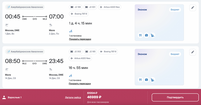 Для тех, кто копит бонусные мили или статус, такие рейсы не подойдут, так как чартерный блок не засчитывается в начислении полетных сегментов и миль. Зато вы можете купить обратный билет с Мальдив в Москву за 1000 миль и 35к на сайте авиакомпании И получить свои 3000 квалификационных миль. Если они вам нужны.