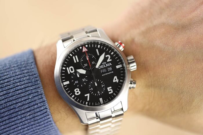 Высококачественная швейцарская марка, работающая в сегменте доступной роскоши, специализируется в первую очередь в покорении морской стихии. Но не оставляет без внимания и стихию воздушную. Ярко выраженными «пилотами» являются, например, модели из коллекции Commander. Один из характерных образцов – хронограф на безотказном и точном автоматическом калибре ЕТА 7750, в 45-миллиметровом стальном корпусе, на стальном браслете. Здесь тоже все как полагается: черный циферблат с идеальной читаемостью (благодаря контрастным и люминесцентным стрелкам и арабским цифрам), удобные заводная головка и кнопки, антибликовое покрытие сапфирового стекла, 100-метровая водозащита. В числе функций не только дата, но и день недели (что, впрочем, не очень характерно для авиационных часов, хотя и не лишнее).