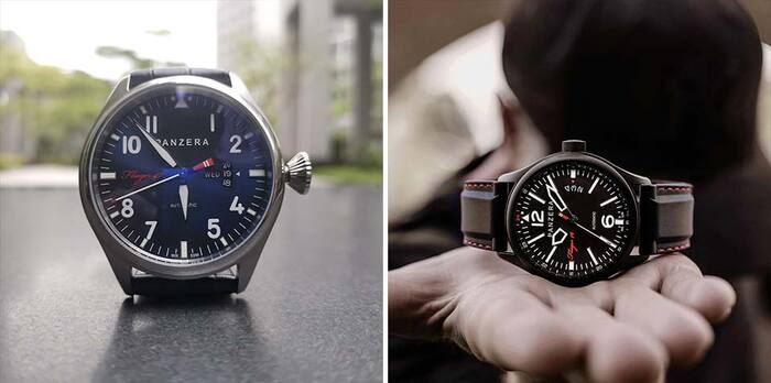 Молодой австралийский часовой бренд действует во всех трех стихиях, выпуская коллекции Sea, Land и Air. Понятно, что в нашей сегодняшней теме именно последняя, представленная линейкой F46, где 46 обозначает диаметр корпуса в мм, а буква F – инициал нанесенного на циферблат слова Flieger, что переводится с немецкого как «летчик». Это массивные круглые стальные часы (с IP-покрытием или без него), сделанные в отчетливо выраженном «пилотском» стиле: мощная заводная головка, предельно ясно читаемый циферблат с крупными люминесцентными арабскими цифрами, метками и стрелками, которые, кстати, стилизованы под лопасти пропеллера, а также декор прозрачной задней крышки, напоминающий лопатки турбины. Водозащита корпуса – 50 м. Функционально часы – трехстрелочник с датой, приводимый в действие автоматическим калибром Seiko TMI NH35. Плюс сапфировое стекло с антибликовым покрытием, плюс несколько цветовых решений, плюс, на выбор, браслет миланского плетения, кожаный ремешок, нейлоновый ремешок NATO.