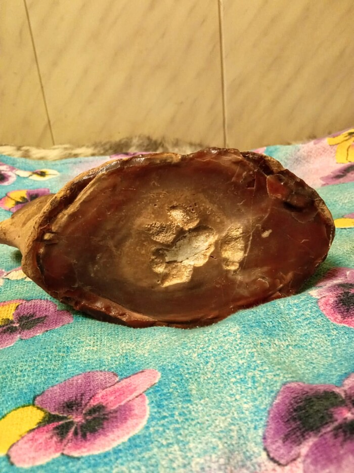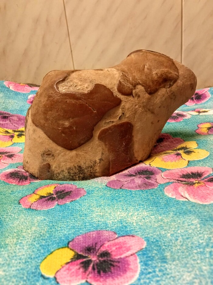 В 2001 году нашёл в городе Зубцов на реке волге, что в Тверской области вот такой вот камень. Выглядит на срезе как окоменелый окорочок, в другом ракурсе как корова. Сейчас нужда поджала, выложил по приколу на авито за 2 миллиона, как думаете найдутся ценители?)