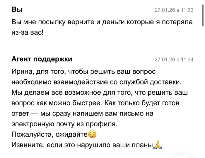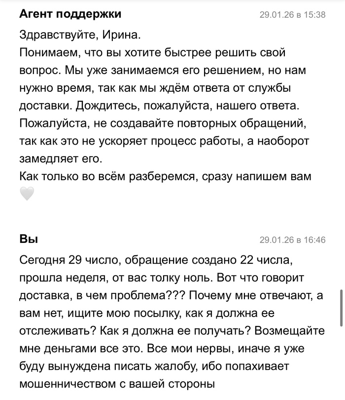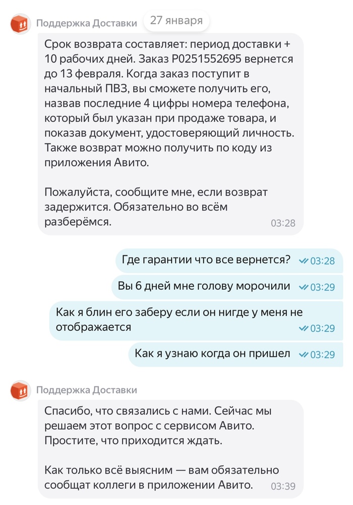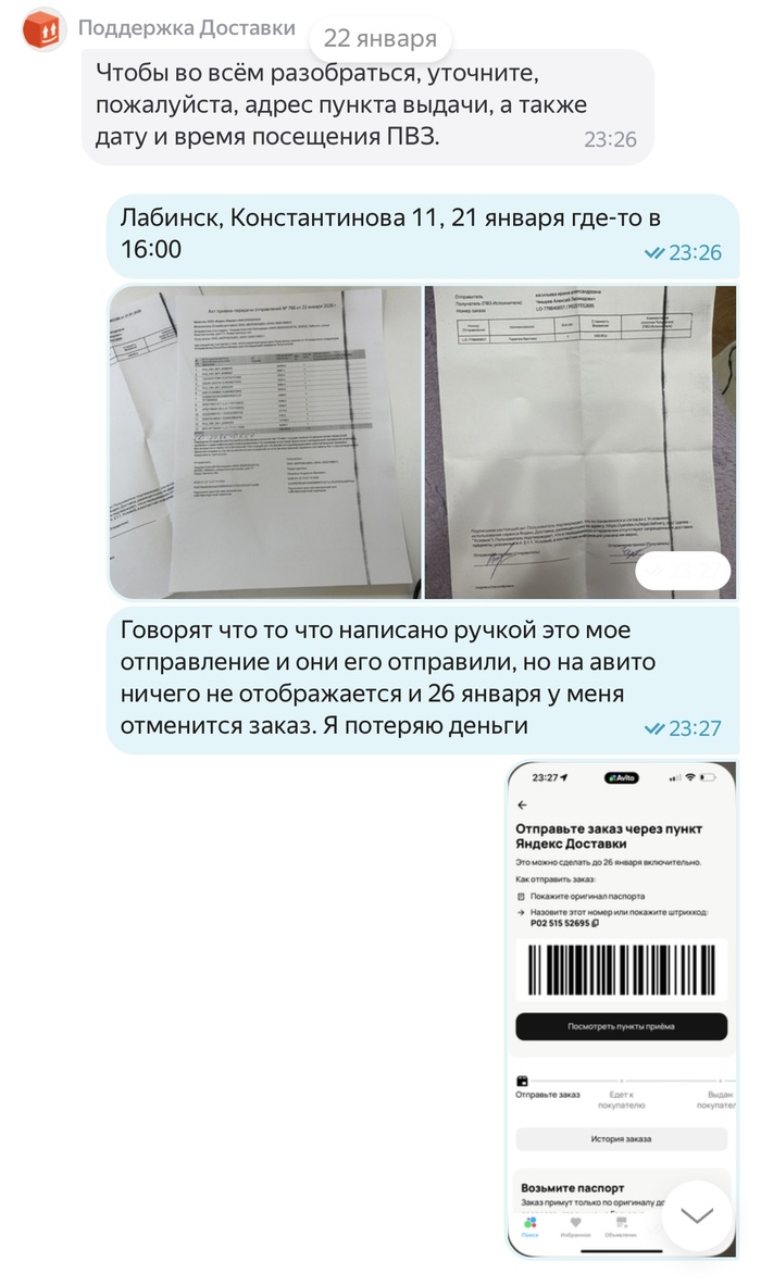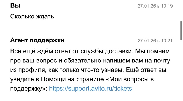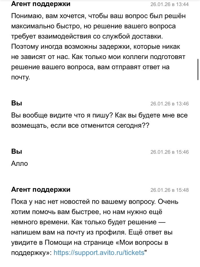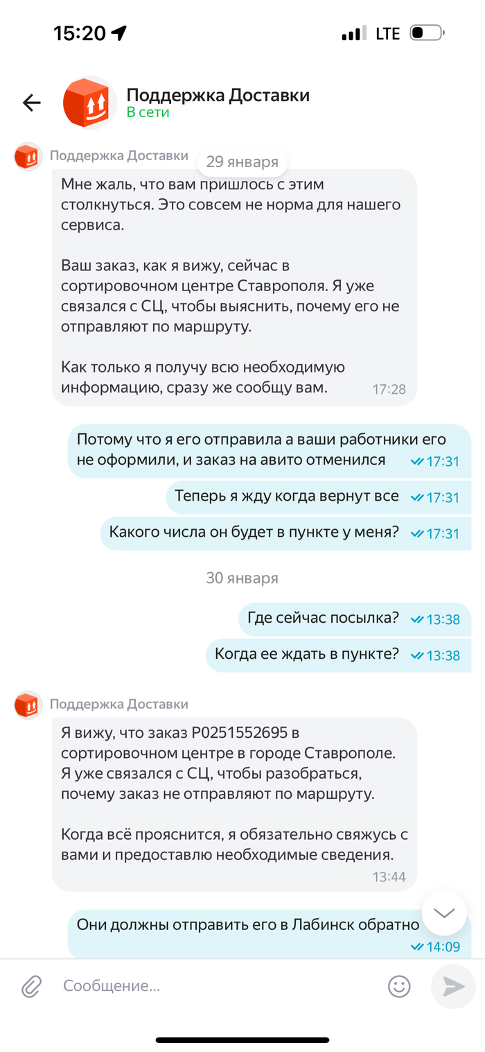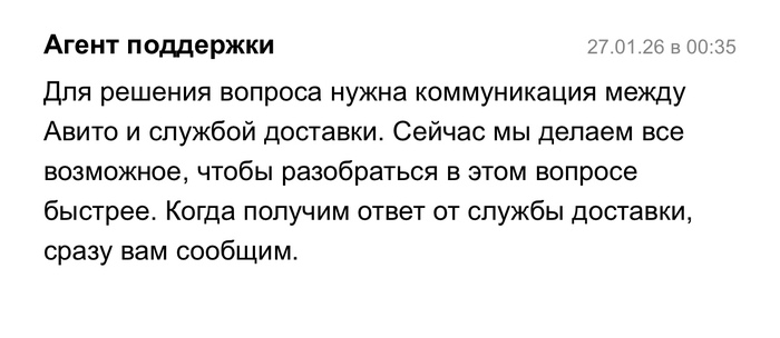 21 января 2026 года в 16:11 я отправляла посылку Авито доставкой, в течении 3 суток посылка висела как непринятая, поддержка успокаивала что такое бывает и все скоро отобразится, а если нет то они возместят убытки. Все бумаги о передачи мной посылки у меня есть. Прошло 3 дня, заказ отменяют, я теряю деньги и соответсвенно свои вещи в посылке. И тут начинается веселье. На протяжении почти месяца мне пишут шаблонами, что да да мы связываемся с поддержкой Яндекс доставки, в свою очередь Яндекс доставка говорит, что они связываются с авито и начинается пересылание меня туда сюда. Я никак не могу добиться того, чтобы мою посылку, а точнее уже возврат вернули обратно. Я знаю что она находится в Ставрополе уже какую неделю, никакую другую информацию за почти месяц мне никто не предоставляет. Я теряю время и деньги. Поддержки вообще не шевелятся, время идет, я так до старости должна ждать или что?