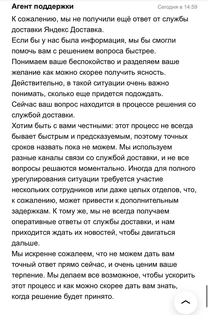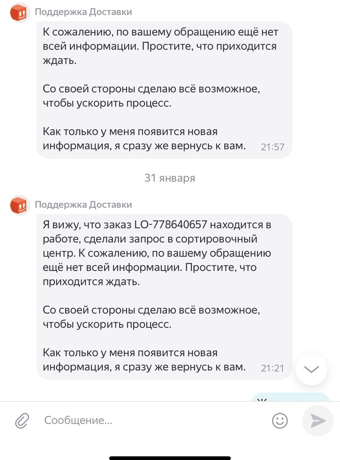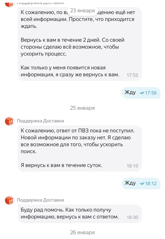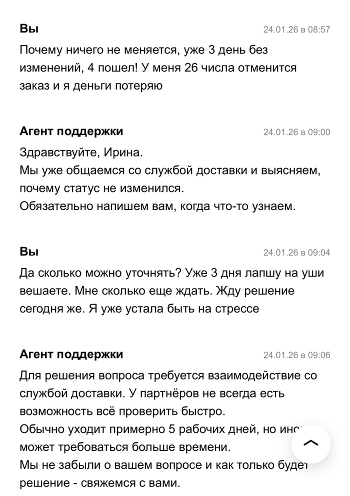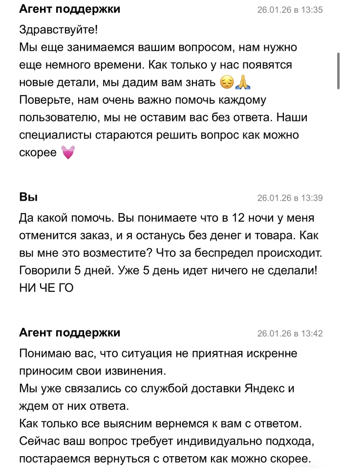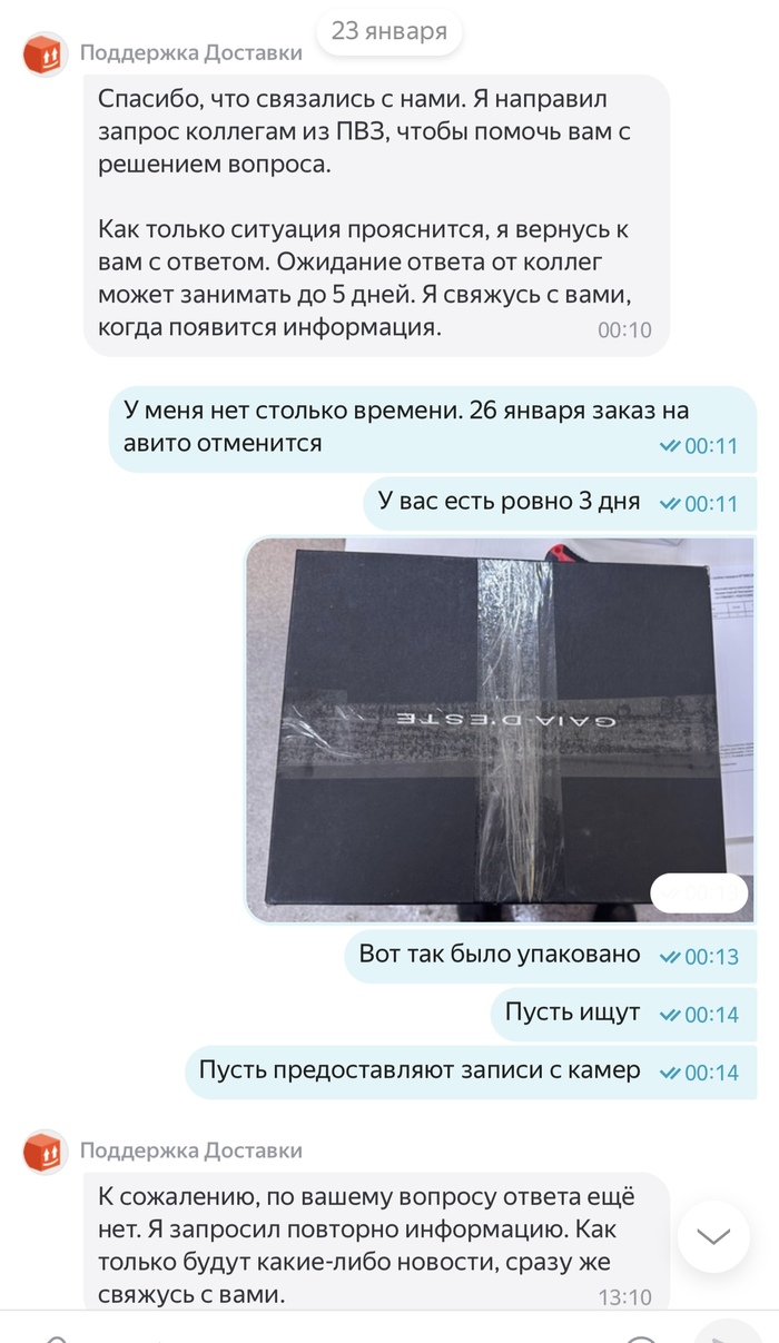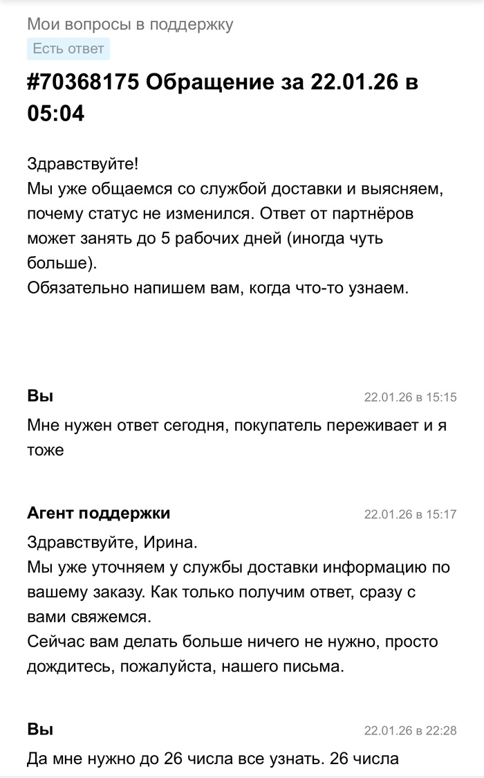 21 января 2026 года в 16:11 я отправляла посылку Авито доставкой, в течении 3 суток посылка висела как непринятая, поддержка успокаивала что такое бывает и все скоро отобразится, а если нет то они возместят убытки. Все бумаги о передачи мной посылки у меня есть. Прошло 3 дня, заказ отменяют, я теряю деньги и соответсвенно свои вещи в посылке. И тут начинается веселье. На протяжении почти месяца мне пишут шаблонами, что да да мы связываемся с поддержкой Яндекс доставки, в свою очередь Яндекс доставка говорит, что они связываются с авито и начинается пересылание меня туда сюда. Я никак не могу добиться того, чтобы мою посылку, а точнее уже возврат вернули обратно. Я знаю что она находится в Ставрополе уже какую неделю, никакую другую информацию за почти месяц мне никто не предоставляет. Я теряю время и деньги. Поддержки вообще не шевелятся, время идет, я так до старости должна ждать или что?