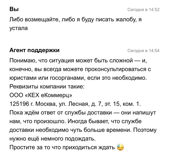 Возможно для кого то это сумма маленькая, но я и такую не хочу терять из-за отвратительного сервиса. По моим сообщениям видно что я устала уже писать одно и тоже и мои нервы сдают. Пусть где-то некорректно, но просто писать в 2 поддержки и слышать что они ничего не получили друг от друга уже смешно