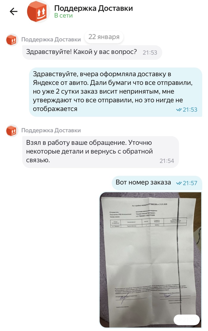 Я продавец, у меня на авито был сделан заказ, который я отправила через Яндекс доставку в пункте приёма и выдачи Яндекса 21 января 2026 года.