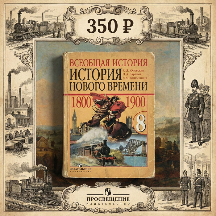 Идея (промпт в боте): Рекламный постер учебника с ценником в стиле графики и картин 1800-1900 года --ar 1:1