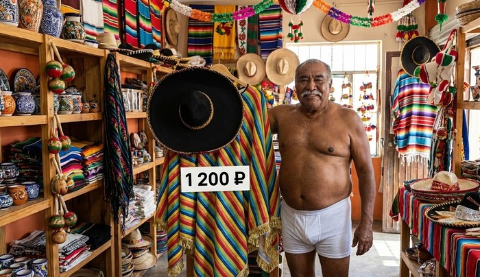 Идея (промпт в боте): Фото из магазина где полуголый мексиканец продает свой костюм
